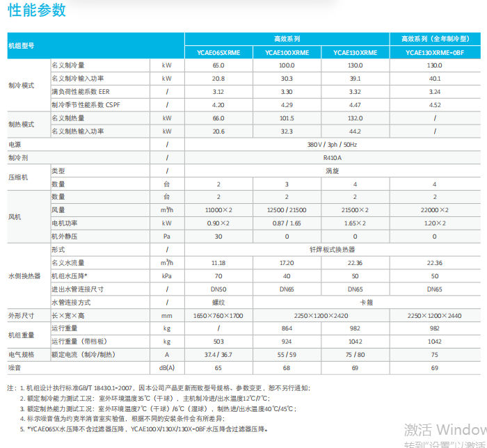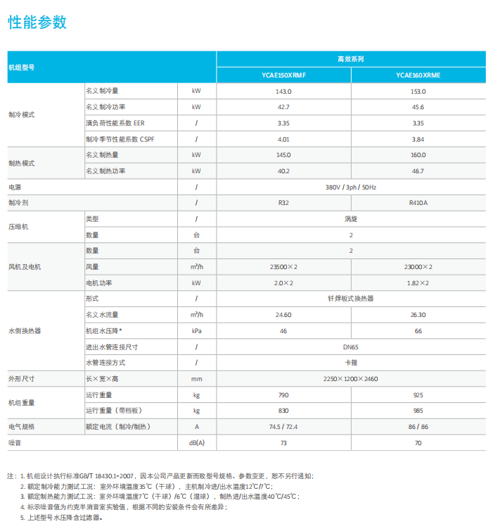 高效設(shè)計 YCAE065X: YCAE100X/130X/160X: 壓縮機(jī)并聯(lián)設(shè)計:單壓縮機(jī)運行時空氣側(cè)換熱器與水側(cè)換熱器的換熱 面積得到充分利用,有效提高機(jī)組性能,尤其是部分負(fù)荷運行時的性能 (YCAE100X/130X); 雙冷媒系統(tǒng)風(fēng)道設(shè)計:單模塊內(nèi)兩套冷媒系統(tǒng)輕松實現(xiàn)完全運 轉(zhuǎn),降低部分負(fù)荷下的風(fēng)機(jī)功耗,性能更優(yōu); * YCAE065GRNE為單壓縮機(jī)系統(tǒng) 交叉對流式水側(cè)換熱器:水側(cè)和兩個制冷劑側(cè)交叉對流換熱,任一板片 間水流同時與兩個制冷劑系統(tǒng)接觸,保證全部水流始終參與換熱, 限度地提高單臺機(jī)組部分負(fù)荷運行時的性能; 多級能量調(diào)節(jié):單模塊多實現(xiàn)四級能量調(diào)節(jié)(0-25%-50%-75%- 100%),單系統(tǒng)可以32臺機(jī)組拼接,能量調(diào)節(jié)范圍高達(dá)128級,接 近無極調(diào)節(jié),效率更高,更節(jié)能。 約克采用多種高效設(shè)計,不斷推出高效環(huán)保節(jié)能型產(chǎn)品,助力城市綠 色發(fā)展,其中YCAE130X為超高能效產(chǎn)品,其制冷季節(jié)系數(shù)CSPF高達(dá) 4.47,超越國家一級能效。YCAE150X充分發(fā)揮R32制冷劑的物理特性, 制冷量提升至143kW(+10% vs 傳統(tǒng)130平臺),制冷COP達(dá)3.35,超越 新國標(biāo)二級能效,是公建項目的理想選擇。