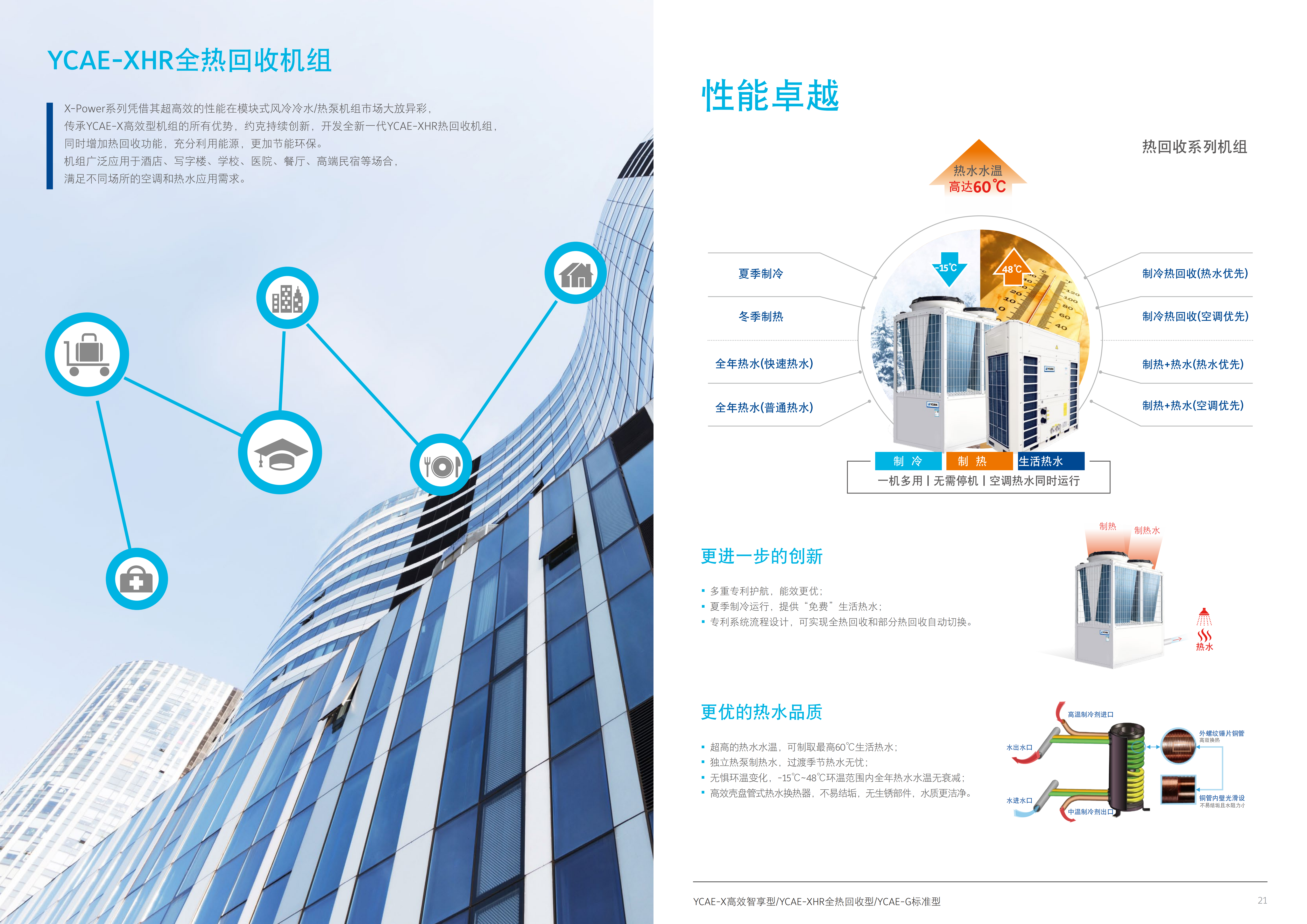 傳承YCAE-X高效型機(jī)組的所有優(yōu)勢(shì),約克持續(xù)創(chuàng)新,開(kāi)發(fā)全新一代YCAE-XHR熱回收機(jī)組,